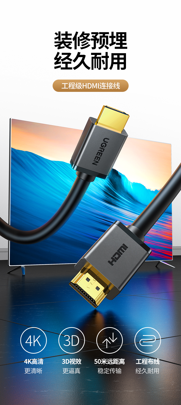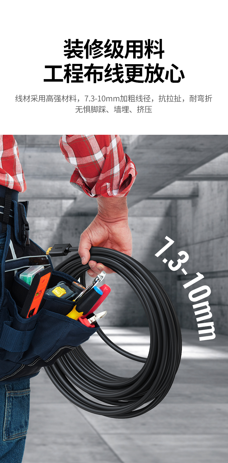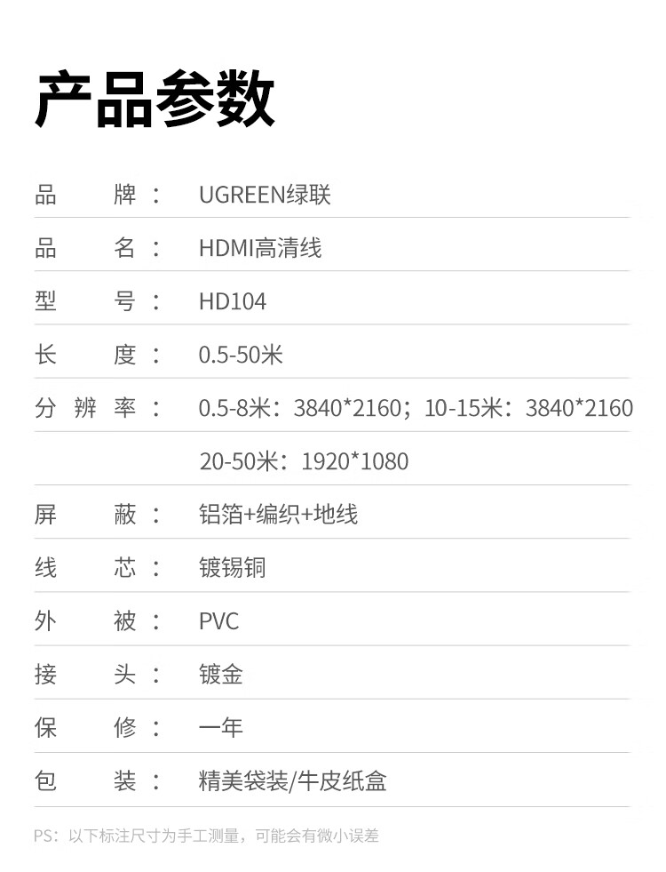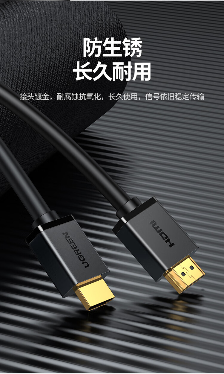 绿联 HDMI黑色线, 1.4版本电脑连接线 24AWG OD10.0MM 支持1080P,60HZ 20米 HD104 10112