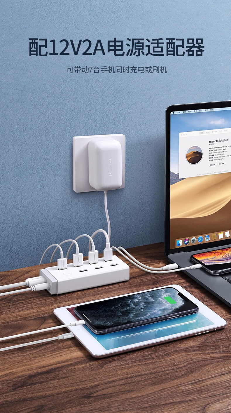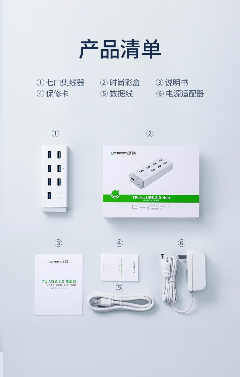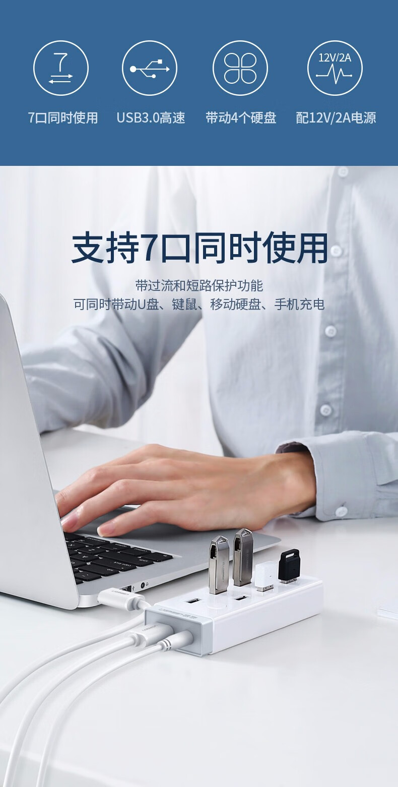 绿联 分线器usb3.0-7口配3C电源,带USB3.0A公对A公1米线,带5V/2A电源适配器,可充电,白色,30303