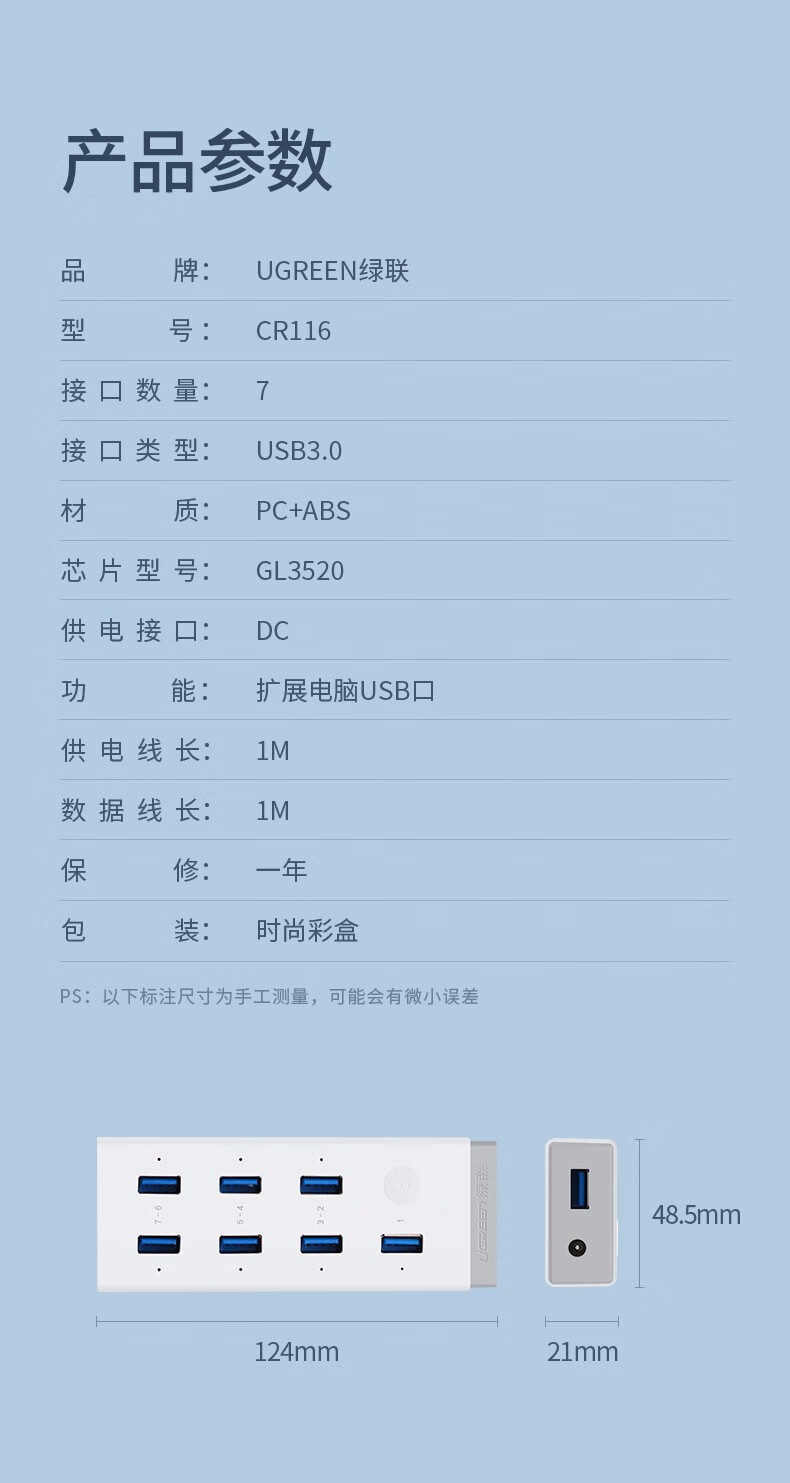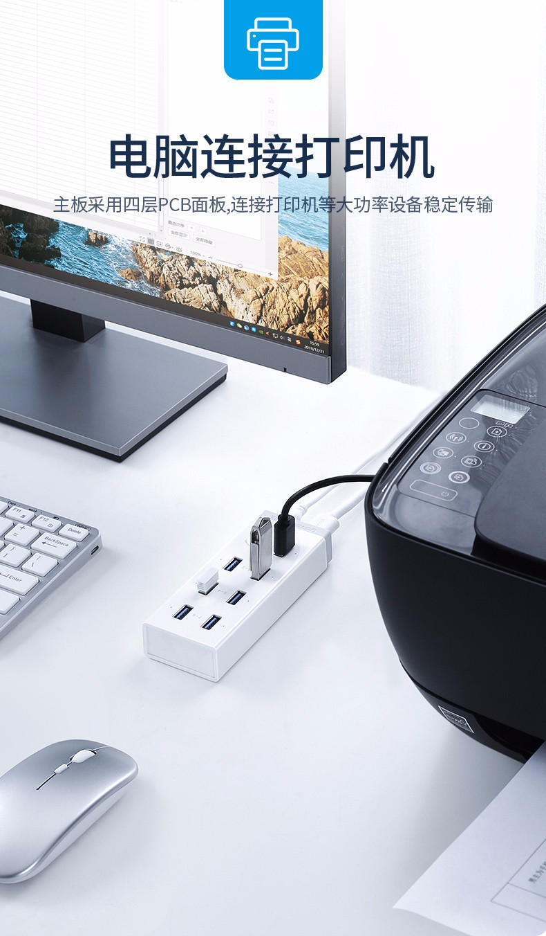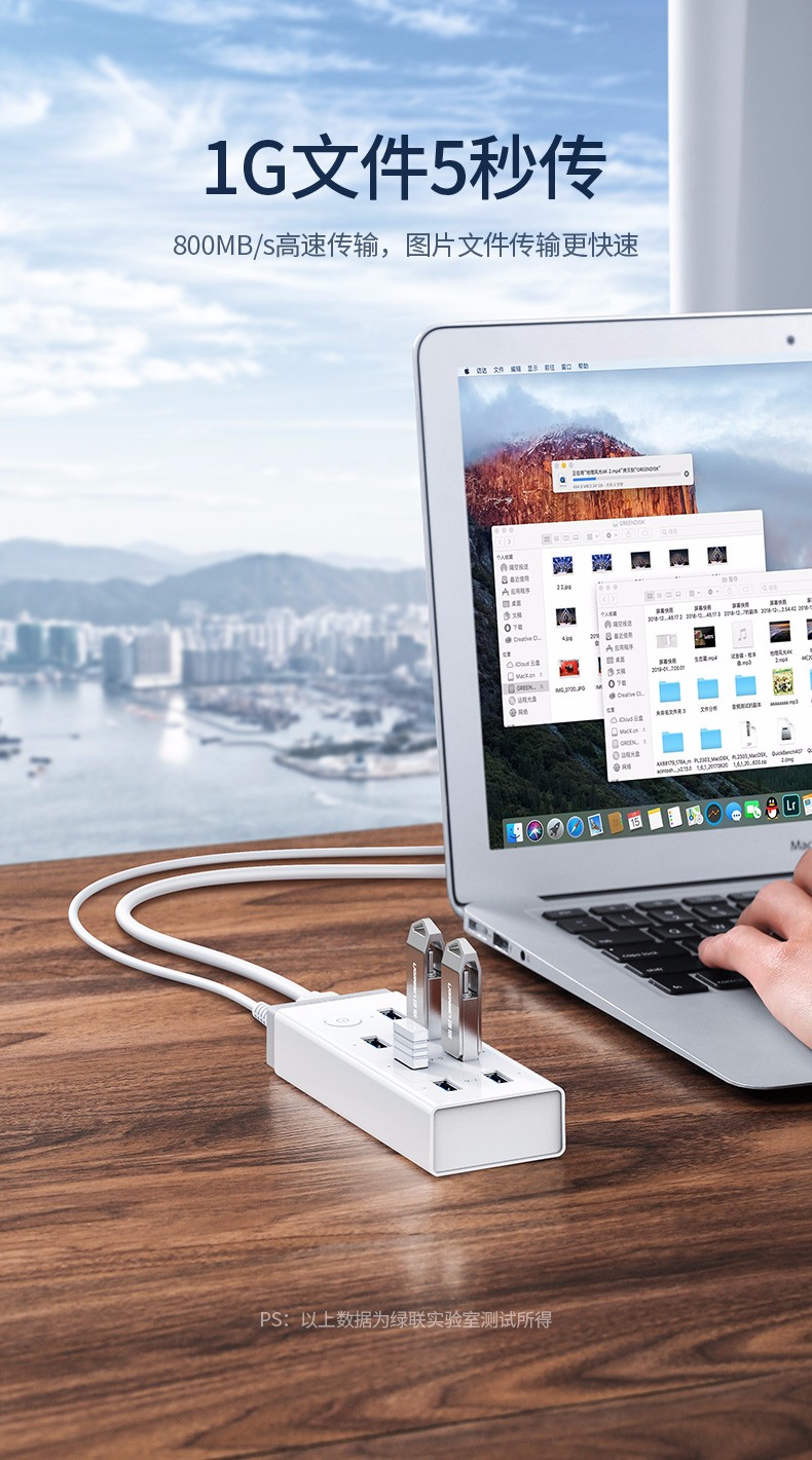 绿联 分线器usb3.0-7口配3C电源,带USB3.0A公对A公1米线,带5V/2A电源适配器,可充电,白色,30303