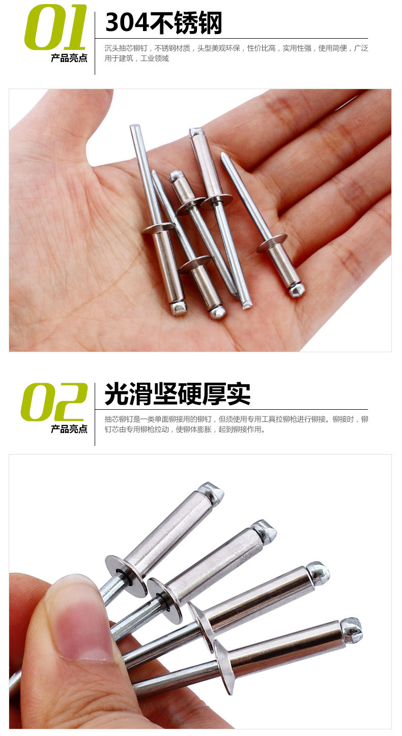 抽芯铆钉由铆体和钉芯两部分组成,是一类单面铆接用的铆钉,但须使用专用工具拉铆枪进行铆接,铆接时,铆钉钉芯由专用铆枪拉动,使铆体膨胀,起到铆接作用,这类铆钉特别适用于不便采用普通铆钉(须从两面进行铆接)的铆接场合,故广泛用于建筑、汽车、船舶、飞机、机器、电器、家具等产品上。其中以开口型扁圆头抽芯铆钉应用最广,沉头抽芯铆钉适用于表现需要平滑的铆接场合,封闭型抽芯铆钉适用于要求随较高载荷和具有一定密封性能的铆接场合。