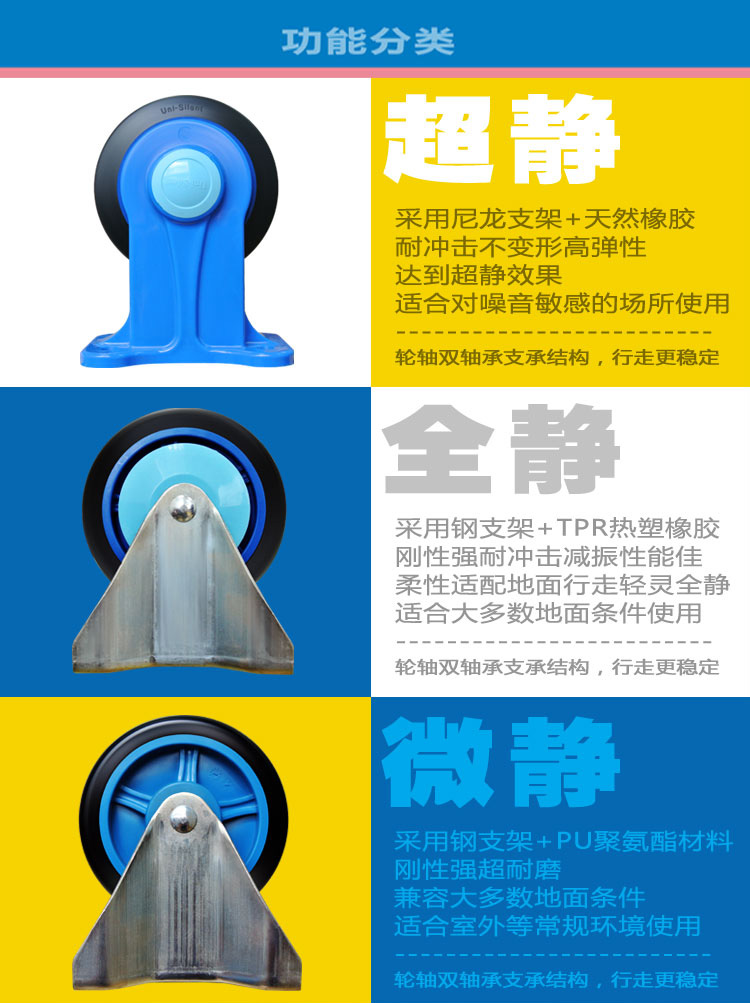 静音手推车由塑料车板、金属扶手(可折倒、固定)、静音脚轮(尼龙支架、铁板支架)等组成。