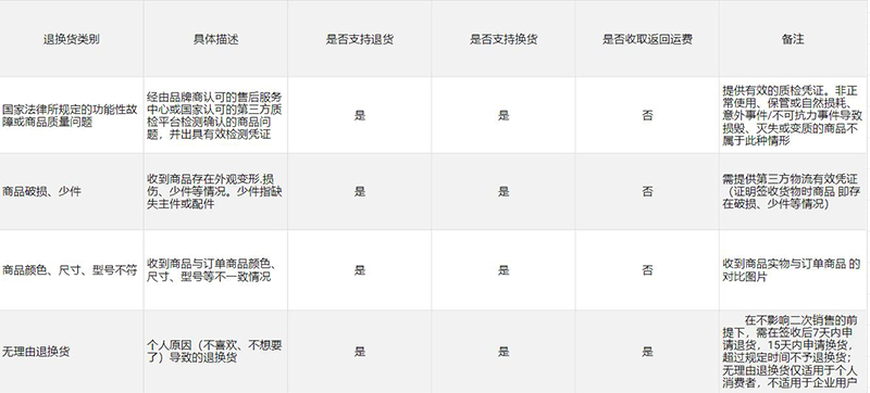 注:符合退换货标准的商品,但已无库存无法换货的,则仅能办理退货退款。
